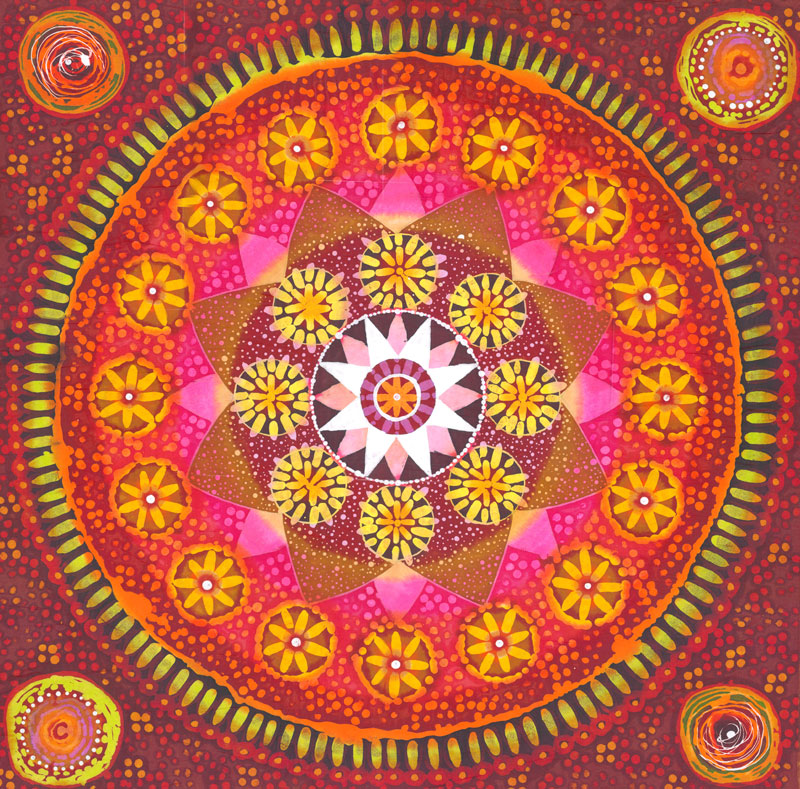 Mandalas Work inspired by my Buddhist practice Click on image to enlarge in viewer Vermillion Mandala 1 Vermillion Mandala 2 Vermillion Mandala 3 Mustard Seed mandala first waxing Mustard Seed Mandala Vermillion mandala 3 detail Back to main gallery page